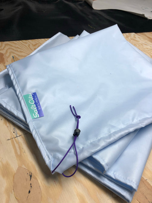38 inches in circumference and 10 feet long Current color of the season!  baby blue nylon with a waterproof outer coating  sails easily slip in, ou...
