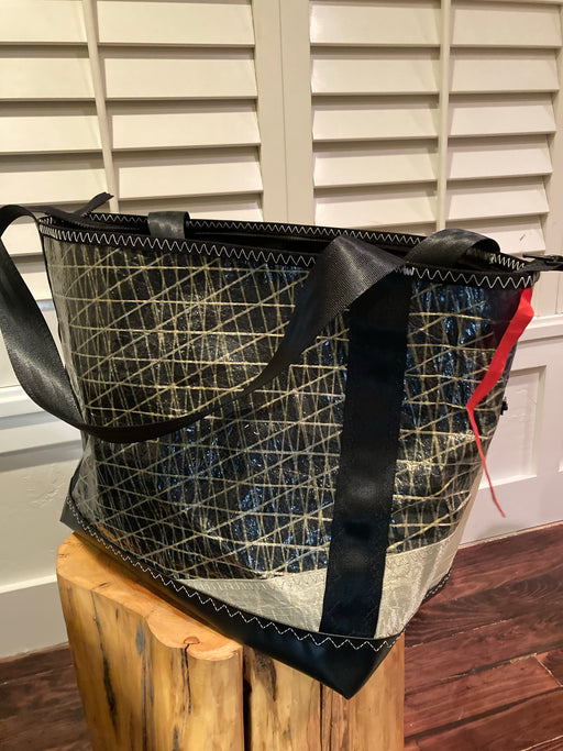 saltcitysailing$150.00One of a kind tote made from factory sail cloth castoffs with vinyl base for a burly tote top zipper and large zippered front pocket. Big boat gre...