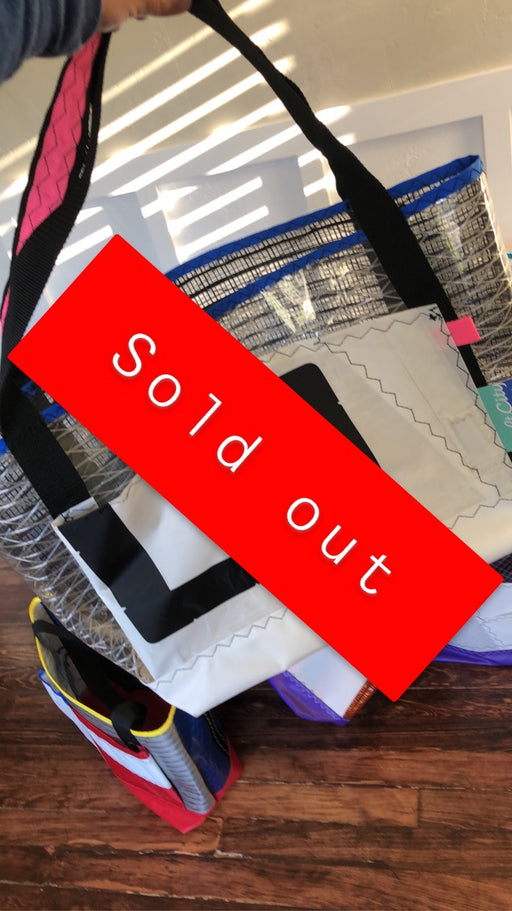 saltcitysailing$159.00One of a kind tote made from factory sail cloth castoffs with vinyl base for a burly tote 14 inches tall 20 wide 11 deep